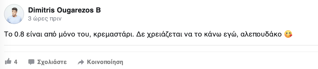 Λίγο αργότερα, ο Δημήτρης Ουγγαρέζος επανήλθε μέσω Facebook, δίνοντας συνέχεια στο «πινγκ πονγκ» με μια αιχμηρή ατάκα: «Το 0,8% είναι από μόνο του, κρεμαστάρι. Δε χρειάζεται να το κάνω εγώ, αλεπουδάκο».