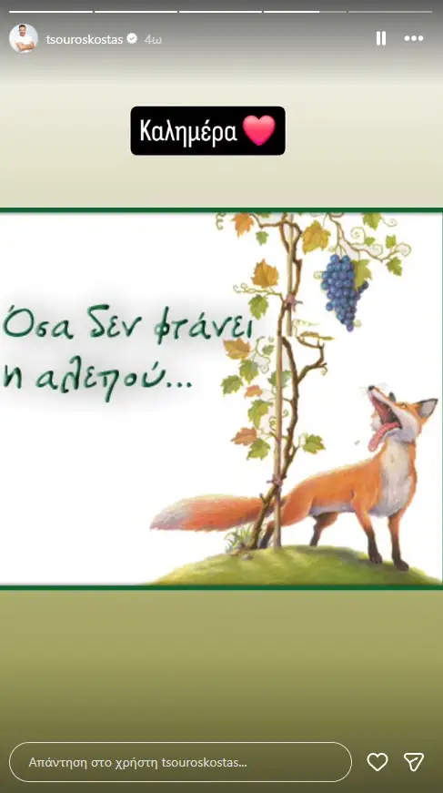 Η απάντηση δεν άργησε να έρθει, με τον Κώστα Τσουρό να επιλέγει έναν πιο έμμεσο τρόπο. Μέσα από story στον προσωπικό του λογαριασμό στο Instagram, ανάρτησε μια εικόνα με μια αλεπού που κοιτάζει ένα σταφύλι σε κληματαριά, συνοδεύοντάς τη με τη φράση «Όσα δεν φτάνει η αλεπού…» (σ.σ. τα κάνει κρεμαστάρια) και ένα «Καλημέρα» με καρδιά.
