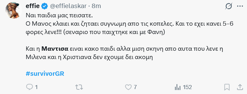 Ενώ ξέρουν οι νέοι ότι έξω ο κόσμος συμπαθεί τη Μαντισα το λογικό θα ήταν να την έχουν από κοντά, αντιθέτως μας λένε ότι δημιουργεί εντάσεις.Δεν πιστευω οτι ειναι τρελοί και τα βγάζουν από το μυαλό τους, κάτι συμβαίνει!!! #survivorGR