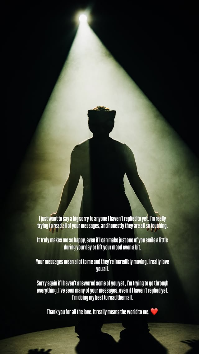 «Θέλω απλώς να ζητήσω μια μεγάλη συγγνώμη από όσους δεν έχω απαντήσει ακόμη. Προσπαθώ πραγματικά να διαβάσω όλα τα μηνύματά σας και ειλικρινά είναι όλα τόσο συγκινητικά. Με κάνει πολύ χαρούμενο, ακόμη κι αν μπορώ να κάνω έστω και έναν από εσάς να χαμογελάσει λίγο μέσα στη μέρα του ή να του φτιάξω έστω και λίγο τη διάθεση».