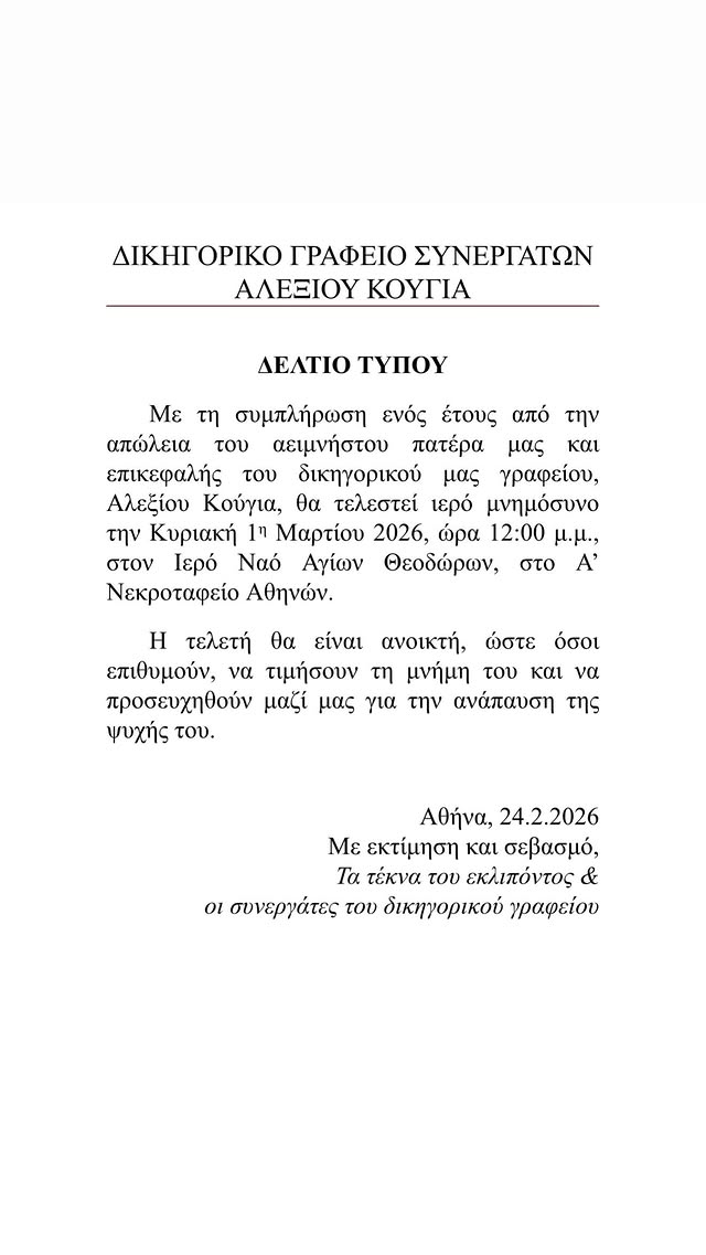 Το πρωί της Τρίτης 24 Φεβρουαρίου, ο γιος του, Χρίστος, προχώρησε σε ανάρτηση στα social media, δημοσιεύοντας επίσημο δελτίο Τύπου του δικηγορικού γραφείου «Δικηγορικό Γραφείο Συνεργατών Αλεξίου Κούγια». Σε αυτό γνωστοποιείται ότι το ετήσιο μνημόσυνο θα τελεστεί την Κυριακή 1 Μαρτίου 2026, στις 12:00, στον Ιερό Ναό Αγίων Θεοδώρων, στο Α’ Νεκροταφείο Αθηνών.