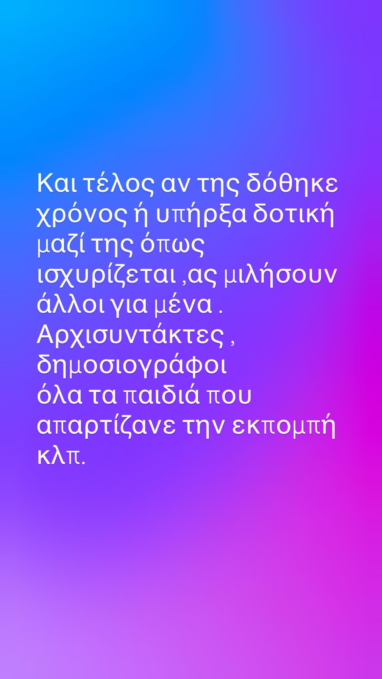 Η παρουσιάστρια στο τέλος έκανε κι ένα story με αιχμή: «Και τέλος αν της δόθηκε χρόνος ή υπήρξα δοτική μαζί της όπως ισχυρίζεται, ας μιλήσουν άλλοι για μένα. Αρχισυντάκτες, δημοσιογράφοι, όλα τα παιδιά που απαρτίζανε την εκπομπή».
