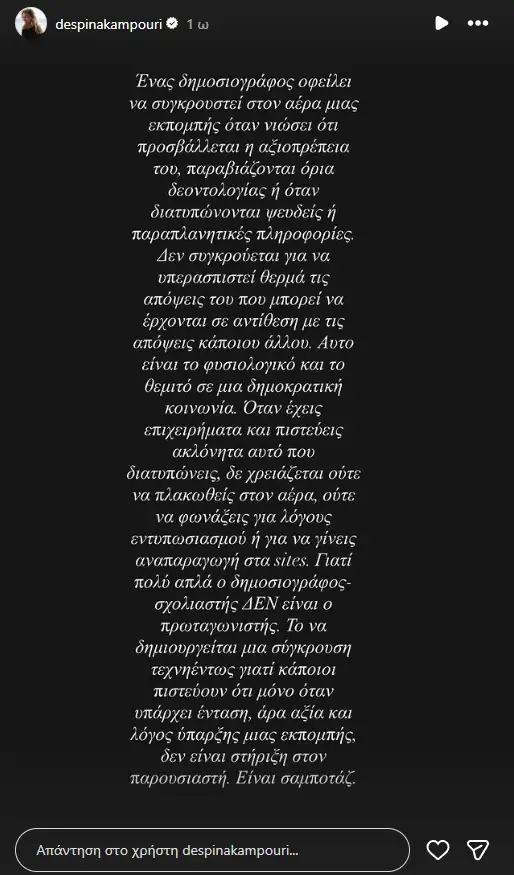 Το να δημιουργείται μια σύγκρουση τεχνηέντως γιατί κάποιοι πιστεύουν ότι μόνο όταν υπάρχει ένταση, άρα αξία και λόγος ύπαρξης μιας εκπομπής, δεν είναι στήριξη στον παρουσιαστή. Είναι σαμποτάζ», έγραψε η Δέσποινα Καμπούρη.