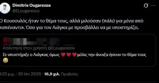 Η απάντηση του Ουγγαρέζου ήταν άμεση και χωρίς περιστροφές: «Ο Κουσουλός ήταν το θέμα τους, αλλά μιλούσαν (πάλι) για μένα από “απέναντι”. Όσο για τον Λιάγκα με προσβάλλει να με υποστηρίζει».