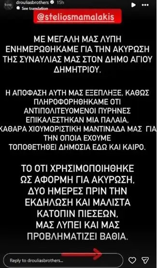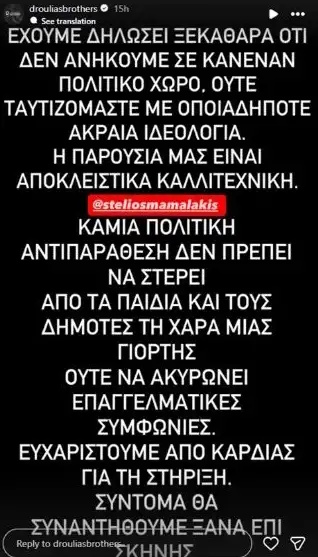 Έχουμε δηλώσει ξεκάθαρα ότι δεν ανήκουμε σε κανέναν πολιτικό χώρο. Ούτε ταυτιζόμαστε με οποιαδήποτε ακραία ιδεολογία. Η παρουσία μας είναι αποκλειστικά καλλιτεχνική. Καμία πολιτική αντιπαράθεση δεν πρέπει να στερεί από τα παιδιά και τους δημότες τη χαρά μιας γιορτής ούτε να ακυρώνει επαγγελματικές συμφωνίες. Ευχαριστούμε από καρδιάς για τη στήριξη. Σύντομα θα συναντηθούμε ξανά επί σκηνής», έγραψαν στην ανάρτησή τους οι Droulias Brothers.