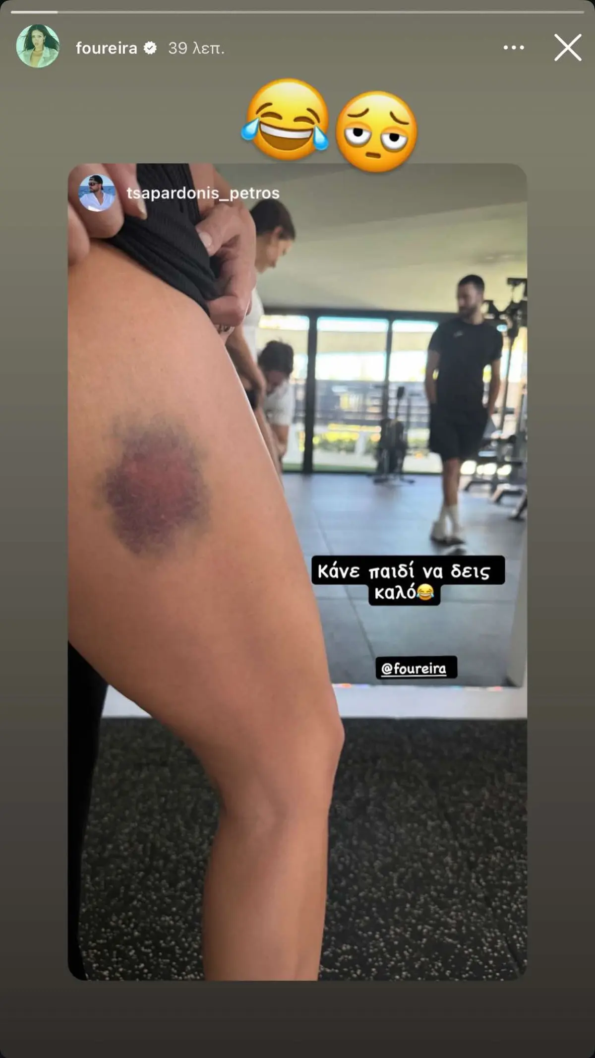 Βέβαια, τα παιχνίδια με ένα παιδί κρύβουν και… μικρά απρόοπτα. Η τραγουδίστρια έχει μοιραστεί με τους διαδικτυακούς της φίλους ότι κάποιες φορές αυτά τα «ατυχήματα» αφήνουν και σημάδια. Έτσι, την Παρασκευή 3 Οκτωβρίου, μέσα από το Instagram, αναδημοσίευσε ένα story του φίλου της, Πέτρου, στο οποίο φαινόταν μια τεράστια μελανιά που της προκάλεσε ο Ερμής την ώρα που έπαιζαν.