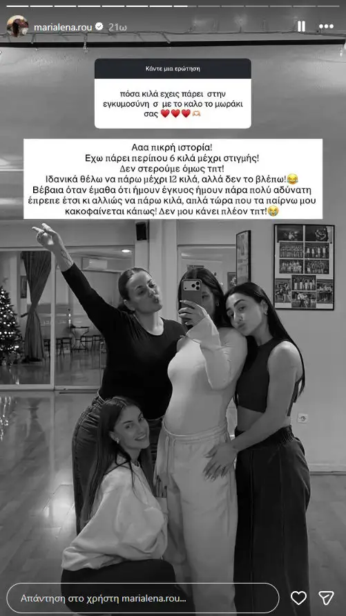 Την ίδια ώρα, η Μαριαλένα Ρουμελιώτη άνοιξε διάλογο με τους διαδικτυακούς της φίλους μέσα από νέο Q&A στο Instagram. Μεταξύ άλλων, ρωτήθηκε για τα κιλά που έχει πάρει μέχρι στιγμής στην εγκυμοσύνη της και απάντησε με ειλικρίνεια: