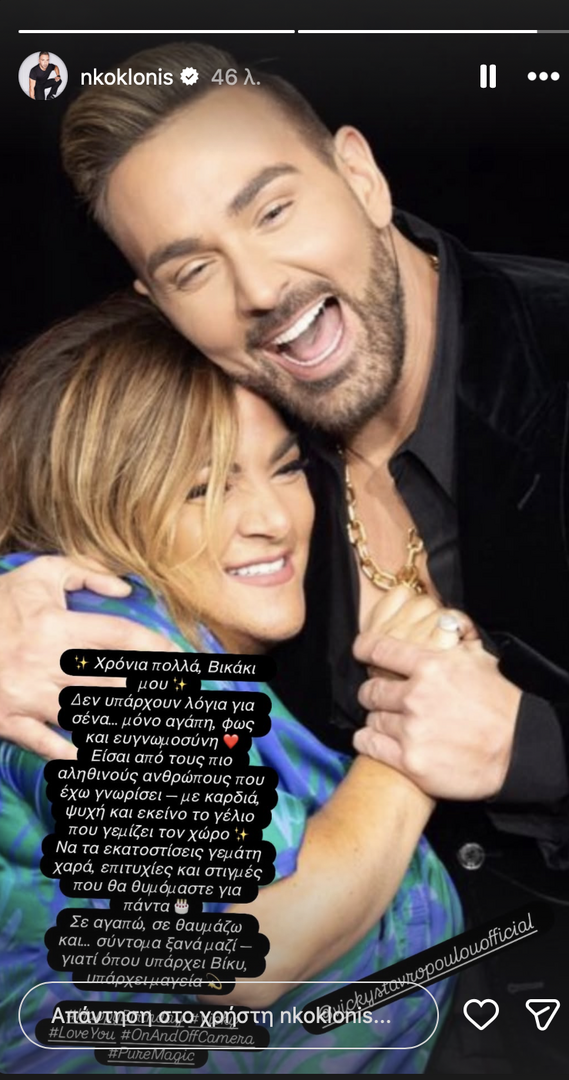«Χρόνια πολλά Βικάκι μου. Δεν υπάρχουν λόγια για εσένα… μόνο αγάπη, φως και ευγνωμοσύνη. Είσαι από τους πιο αληθινούς ανθρώπους που έχω γνωρίσει – με καρδιά, ψυχή και εκείνο το γέλιο που γεμίζει τον χώρο. Να τα εκατοστήσεις γεμάτη χαρά, επιτυχίες και στιγμές που θα θυμόμαστε για πάντα! Σε αγαπώ, σε θαυμάζω και… σύντομα ξανά μαζί – γιατί όπου υπάρχει Βίκυ, υπάρχει μαγεία!».