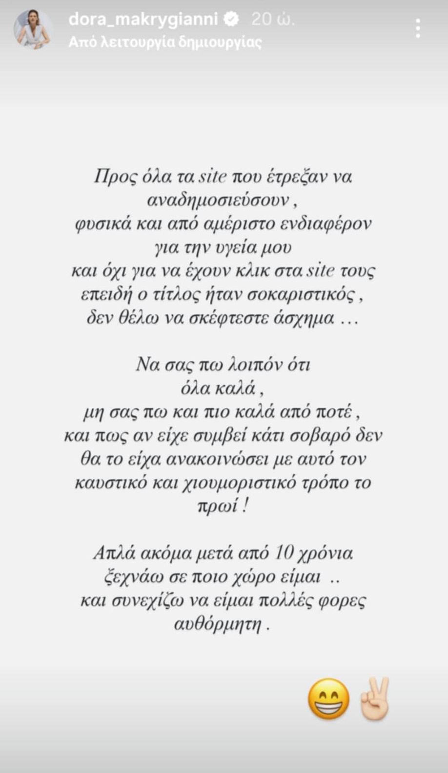 Με μία της ανάρτηση η Ντόρα Μακρυγιάννη θέλησε να ξεκαθαρίσει ότι παρά τους βαρύγδουπους τίτλους που υπήρξαν για το τροχαίο της, είναι μια χαρά και δεν συντρέχει λόγος ανησυχίας.
