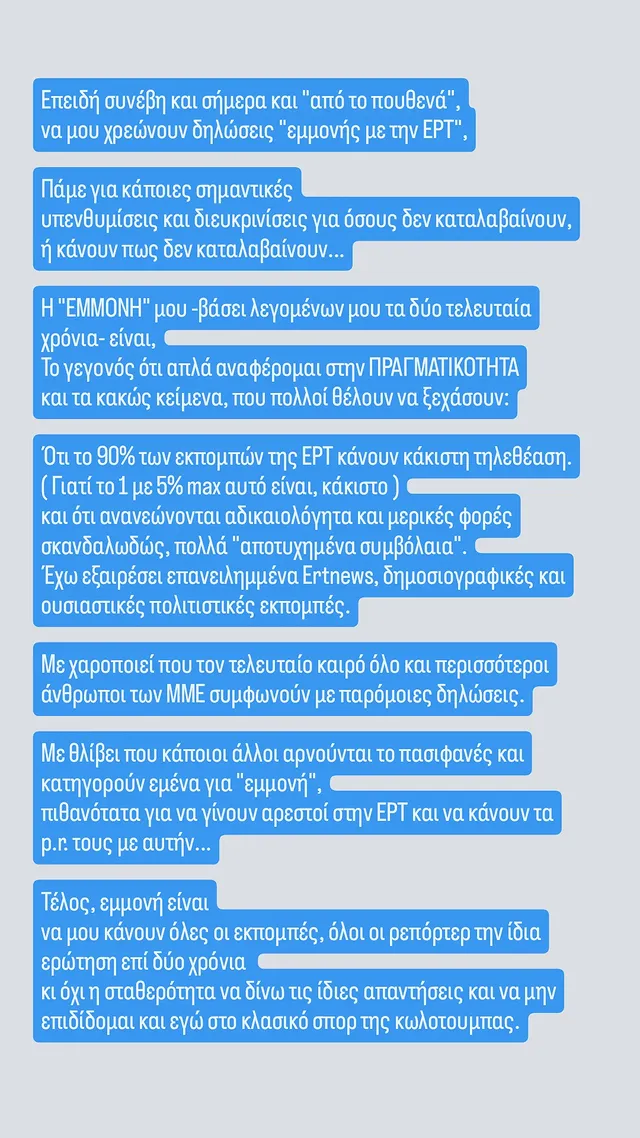 «Επειδή συνέβη και σήμερα και “από το πουθενά” να μου χρεώνουν δηλώσεις “εμμονής με την ΕΡΤ”, πάμε για κάποιες σημαντικές υπενθυμίσεις και διευκρινίσεις για όσους δεν καταλαβαίνουν ή κάνουν πως δεν καταλαβαίνουν…