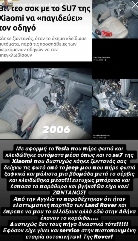 «Με αφορμή το Tesla που πήρε φωτιά και κλειδώθηκε αυτόματα μέσα, όπως και το SU7 της Xiaomi που δυστυχώς κάηκε ζωντανός, σας δείχνω τις φωτογραφίες από το jeep μου που πήρε φωτιά ξαφνικά και μάλιστα μία εβδομάδα μετά το σέρβις και κλειδώθηκα μέσα! Ευτυχώς μπόρεσα και έσπασα το παράθυρο και βγήκα! Θα είχα καεί ζωντανός! Από την Αγγλία το παραδέχτηκαν ότι ήταν ελαττωματική παρτίδα των Land Rover και έπρεπε να μου το αλλάξουν, αλλά εδώ στην Αθήνα έκαναν το κορόιδο…