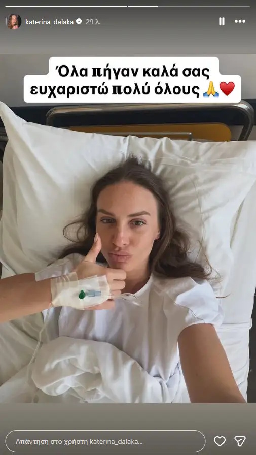 Η γνωστή αθλήτρια και πρώην παίκτρια του Survivor δημοσίευσε φωτογραφία της από το κρεβάτι του νοσοκομείου γράφοντας: «Όλα πήγαν καλά, σας ευχαριστώ πολύ για όλους», αφήνοντας να εννοηθεί πως η ίδια υποβλήθηκε σε χειρουργική επέμβαση.