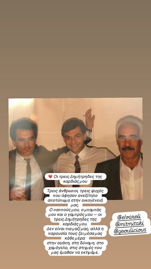 «Οι τρεις Δημήτρηδες της καρδιάς μου. Τρεις άνθρωποι, τρεις ψυχές που άφησαν ανεξίτηλο αποτύπωμα στην οικογένειά μας. Ο παππούς μου, ο μπαμπάς μου και ο γαμπρός μου — οι τρεις Δημήτρηδες της καρδιάς μου.