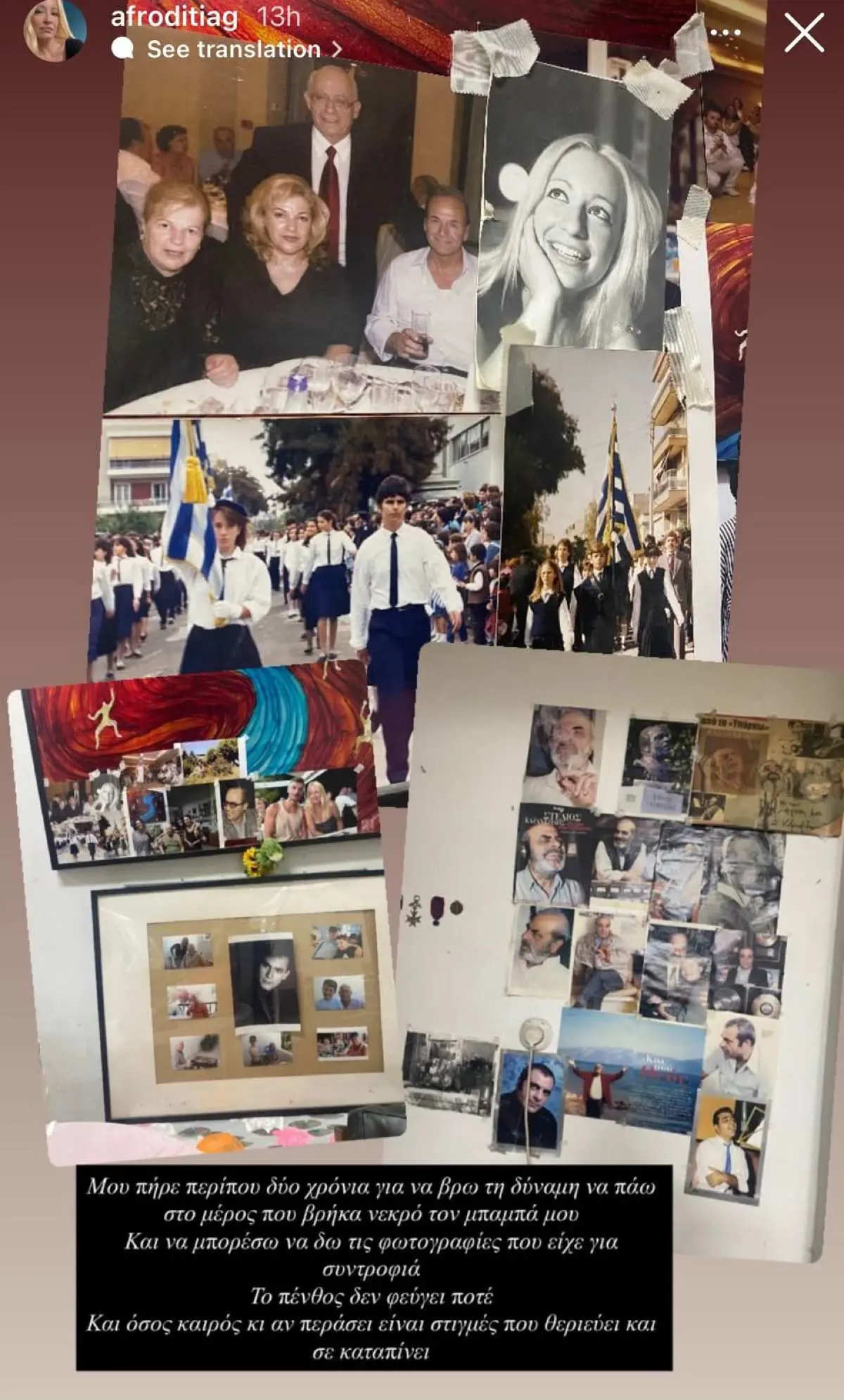 Μία συγκλονιστική ανάρτηση έκανε η Αφροδίτη Γραμμέλη για την απώλεια του πατέρα της πριν από δύο χρόνια. Η δημοσιογράφος δημοσίευσε σήμερα ένα story με οικογενειακές φωτογραφίες που είχε ο πατέρας της στο σπίτι της κι έγραψε: