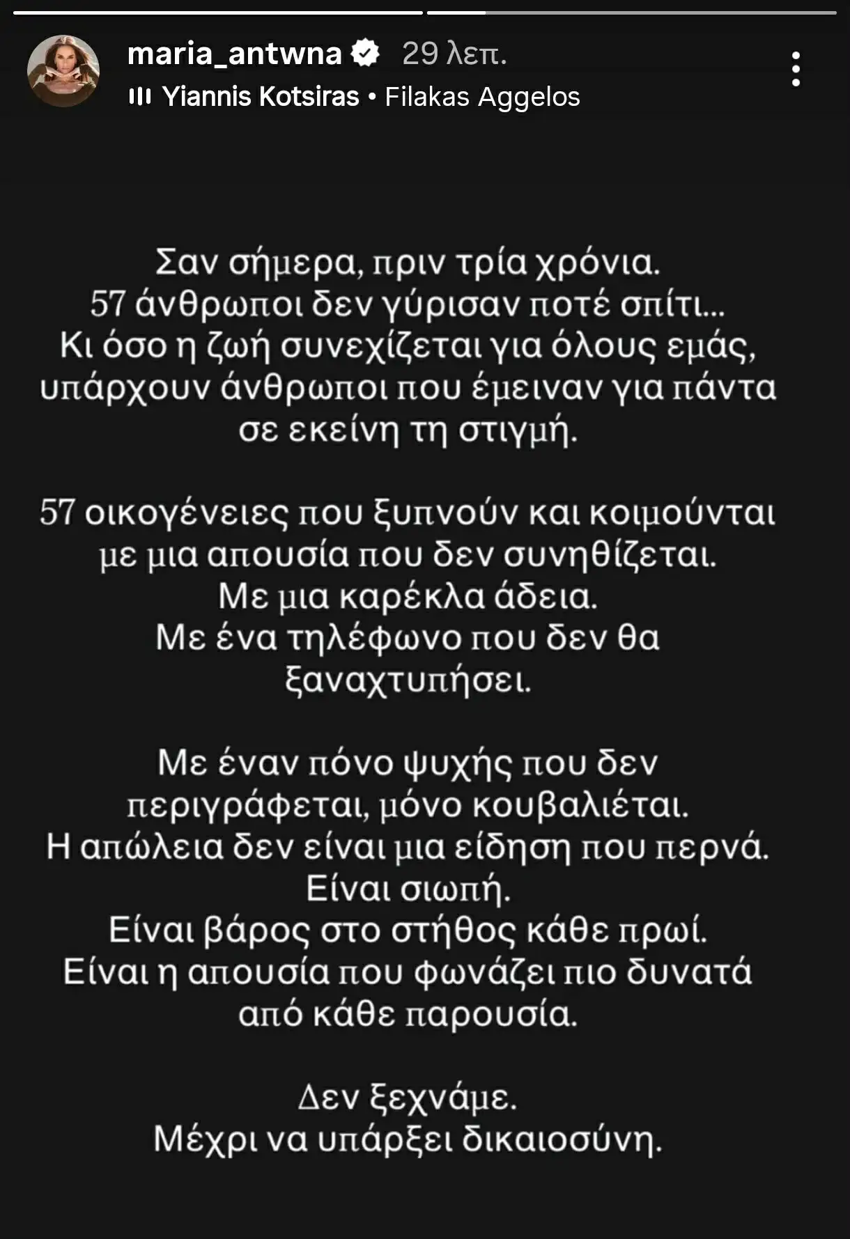 57 οικογένειες που ξυπνούν και κοιμούνται με μια απουσία που δεν συνηθίζεται. Με μια καρέκλα άδεια. Με ένα τηλέφωνο που δεν θα ξαναχτυπήσει. Με έναν πόνο ψυχής που δεν περιγράφεται, μόνο κουβαλιέται. Η απώλεια δεν είναι μια είδηση που περνά. Είναι σιωπή. Είναι βάρος στο στήθος κάθε πρωί. Είναι η απουσία που φωνάζει πιο δυνατά από κάθε παρουσία. Δεν ξεχνάμε. Μέχρι να υπάρξει δικαιοσύνη» γράφει η Μαρία Αντωνά.