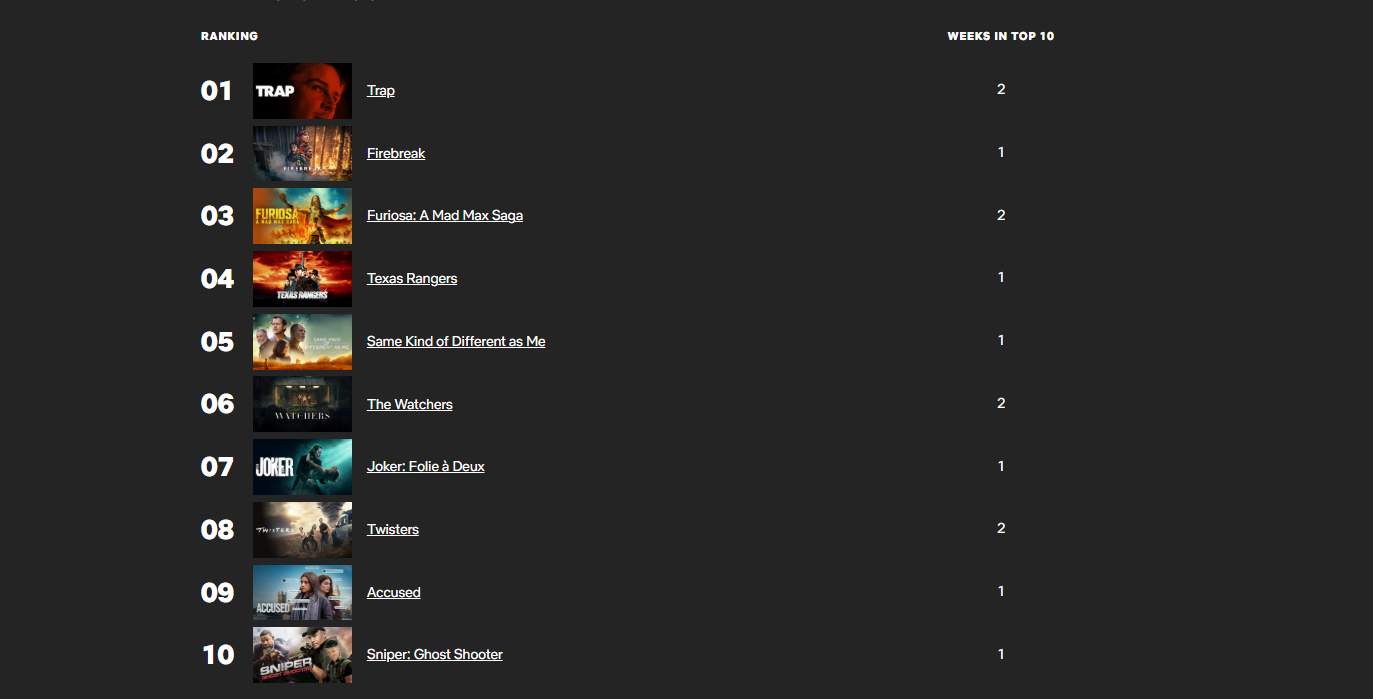 Αυτές τις ημέρες, στην κορυφή της λίστας βρίσκεται το Trap, το οποίο συνεχίζει να τραβά το ενδιαφέρον του κοινού για δεύτερη εβδομάδα. Αμέσως μετά ακολουθεί το Firebreak, μια ταινία δράσης που έχει κάνει δυναμική είσοδο στο ελληνικό Top 10.